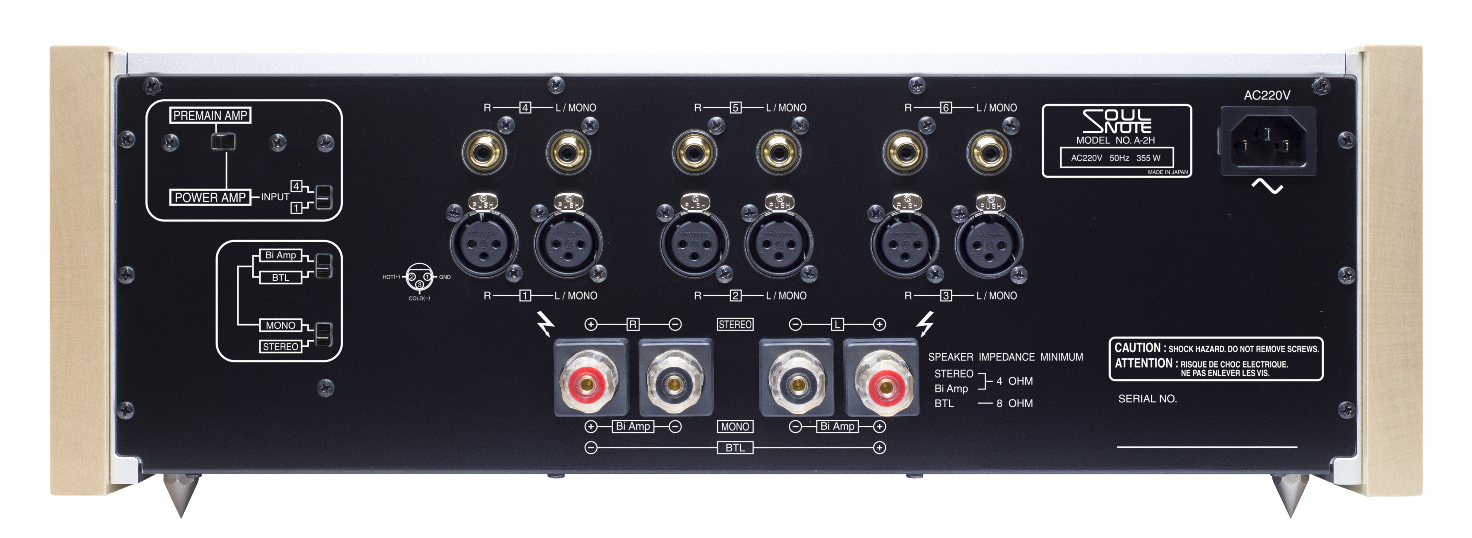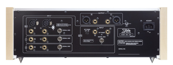 輸入端子:XLR(5.6 Vrms)*1;RCA(2.8 Vrms)*4(其中一組可切換使用光學唱頭)