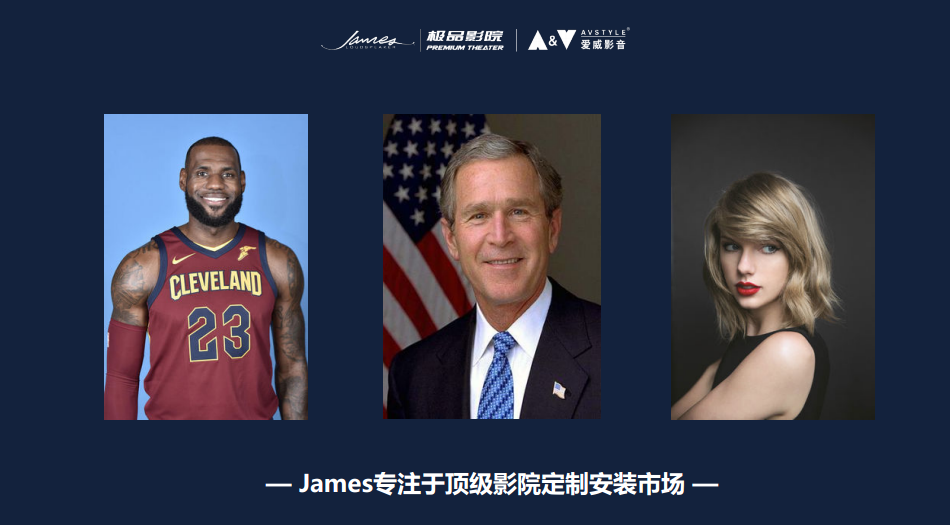 覆蓋10項技術(shù)標(biāo)準(zhǔn)要求、經(jīng)歷4個階段、30個主要步驟流程、120多項工序打造的James極品影院,不僅要成為中國影音行業(yè)樹立頂級私人影院的標(biāo)桿,更要為全中國對私人影院有著更高標(biāo)準(zhǔn)和要求的客戶們提供最全面、最高質(zhì)的規(guī)劃、設(shè)計、施工、安裝、調(diào)試等全程服務(wù),讓客戶們能和唐納德•特朗普總統(tǒng)、小布什總統(tǒng)、NBA頭號球星勒布朗•詹姆斯、歌星泰勒•斯威夫特、前紐約市長邁克爾•布隆伯格、Facebook CEO雪莉•桑德伯格等風(fēng)云人物一樣,享受到極致的聲色人生。
