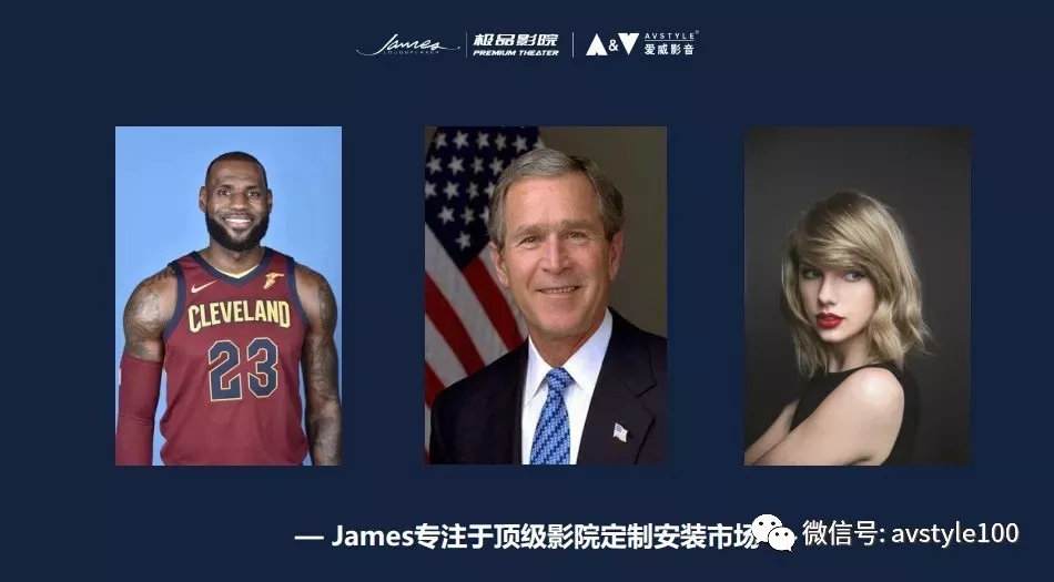 覆蓋10項技術標準要求、經歷4個階段、30個主要步驟流程、120多項工序打造的James極品影院,不僅要成為中國影音行業樹立頂級私人影院的標桿,更要為全中國對私人影院有著更高標準和要求的客戶們提供最全面、最高質的規劃、設計、施工、安裝、調試等全程服務,讓客戶們能和唐納德•特朗普總統、小布什總統、NBA頭號球星勒布朗•詹姆斯、歌星泰勒•斯威夫特、前紐約市長邁克爾•布隆伯格、Facebook CEO雪莉•桑德伯格等風云人物一樣,享受到極致的聲色人生。