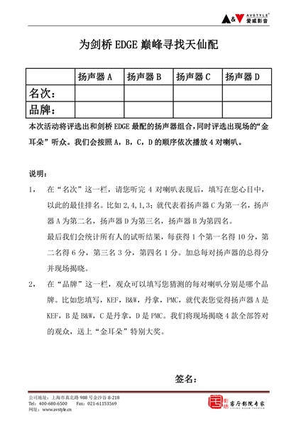 另外,如果現(xiàn)場可以聽出四對揚聲器的播放順序的觀眾,會特別被授予“金耳朵”獎,將會獲得英國劍橋提供的高級無線音箱大獎,也歡迎頂級發(fā)燒友們積極參加。