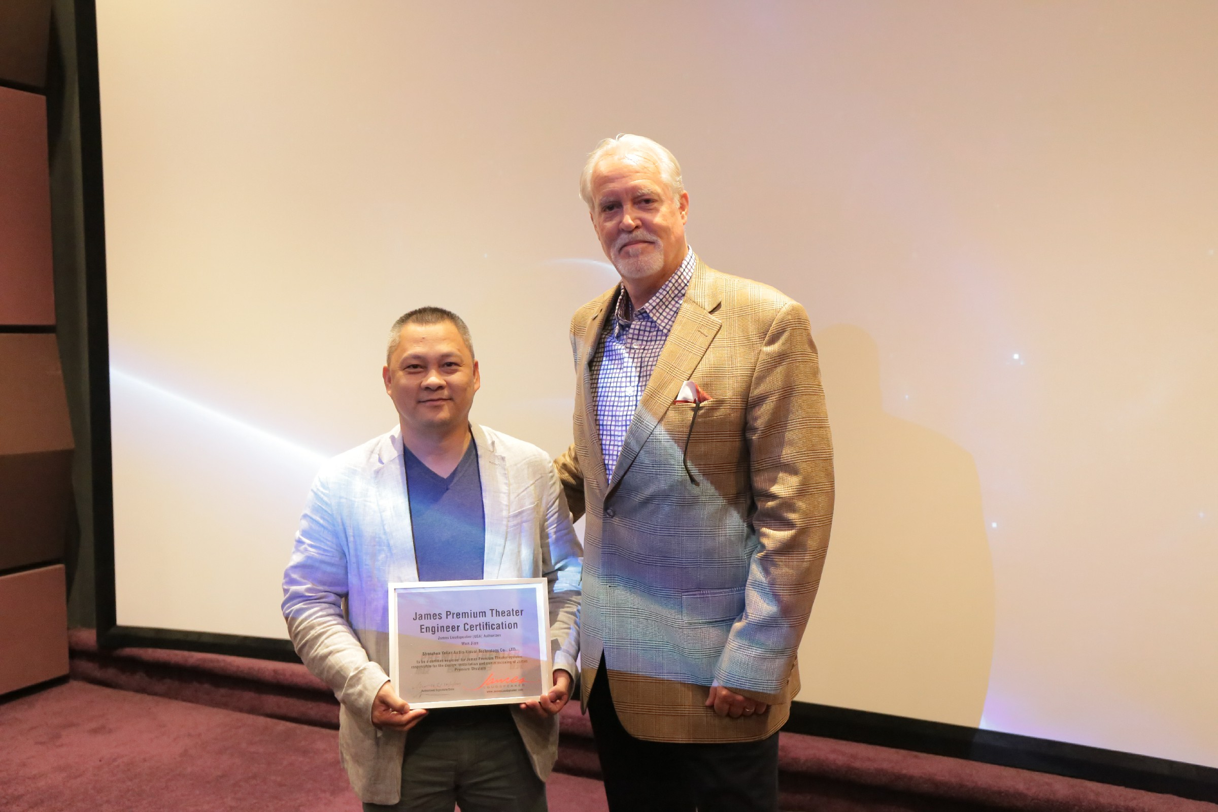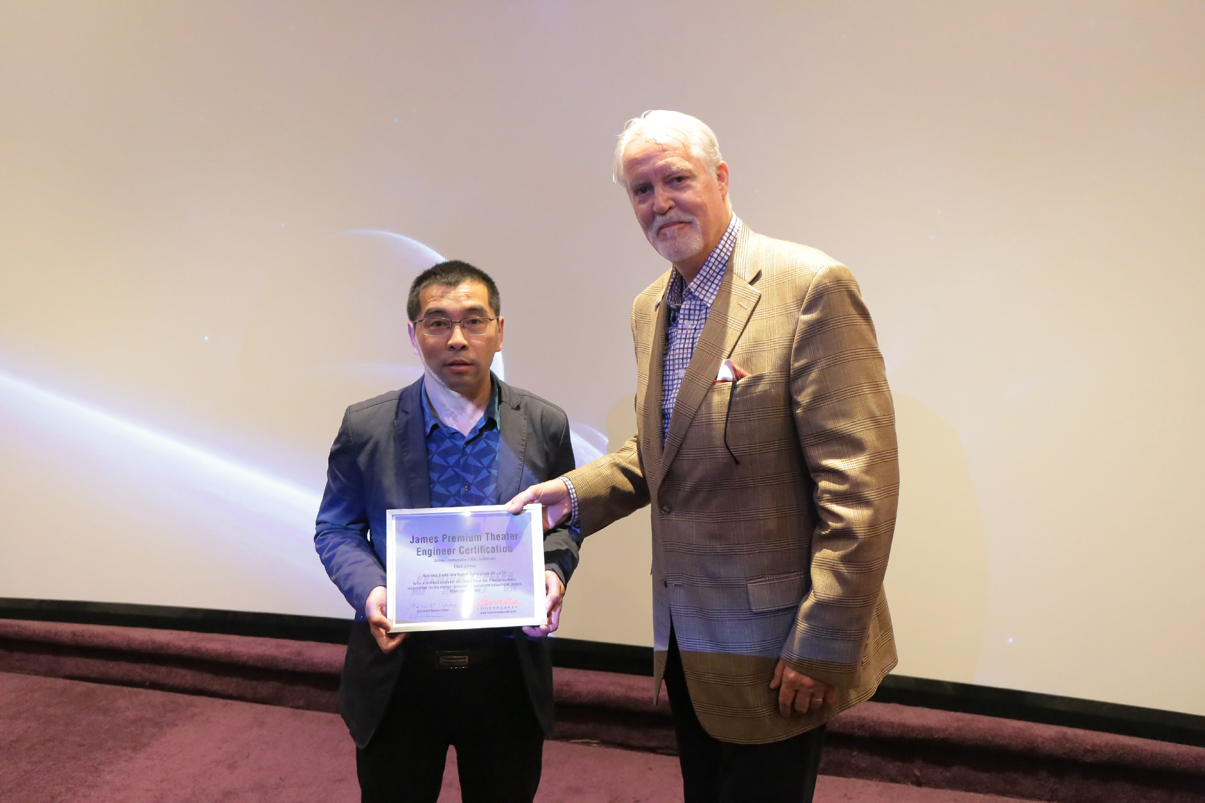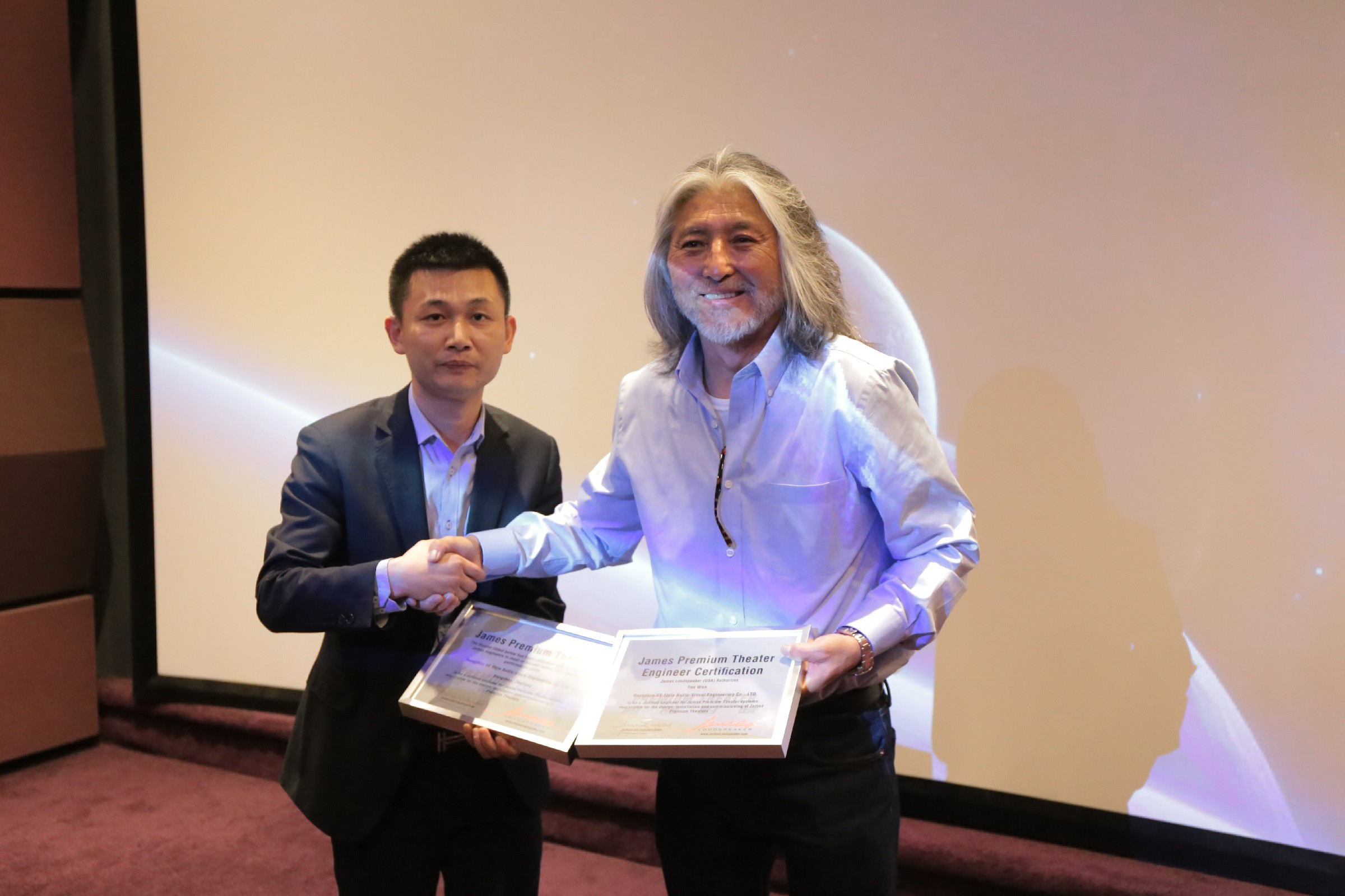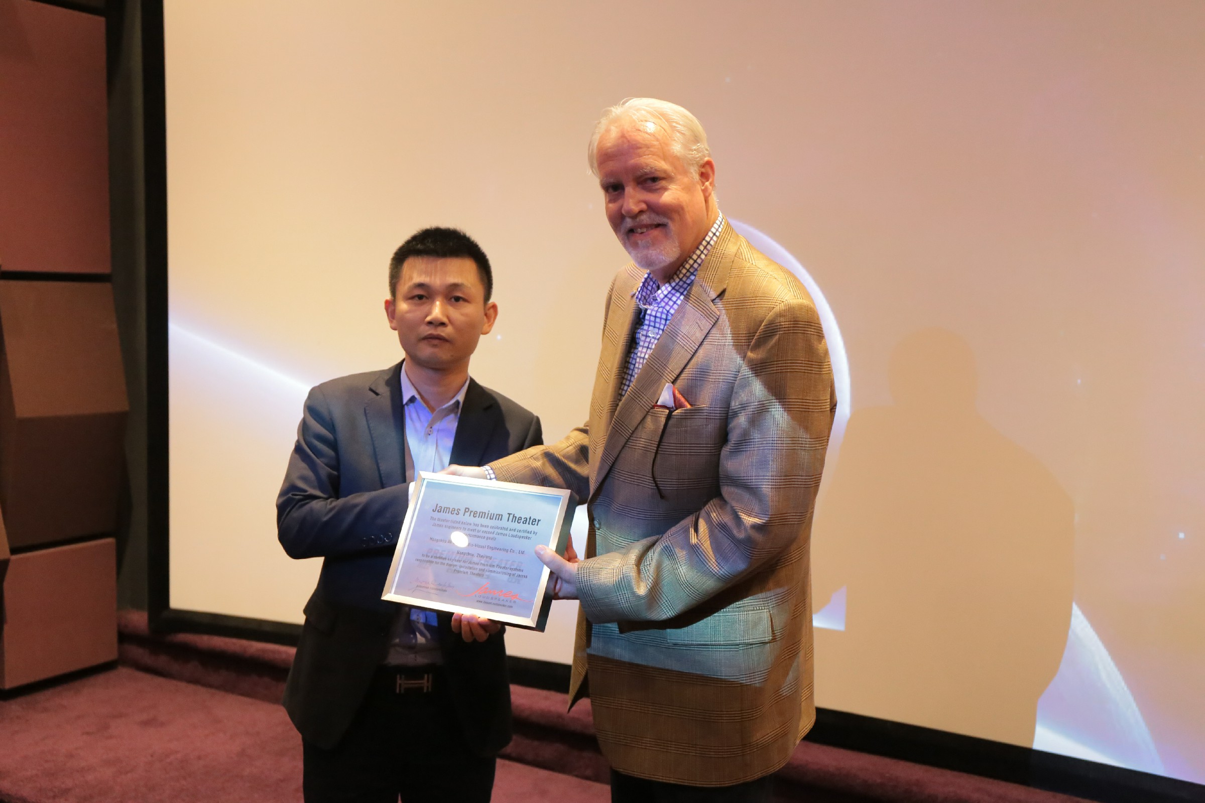 活動中,James極品之父Michael J Park先生和James品牌極品影院項目執行副總裁John Bishop,為中國James極品影院體驗中心及James極品影院工程師頒發證書。
