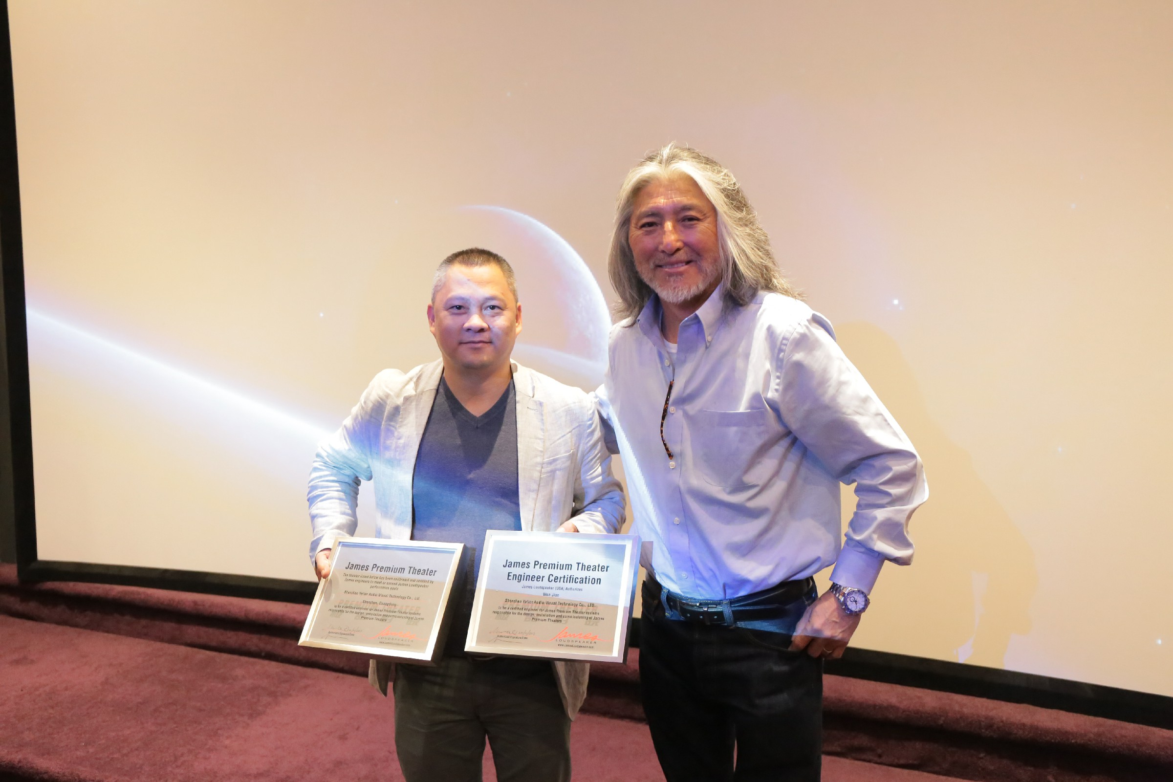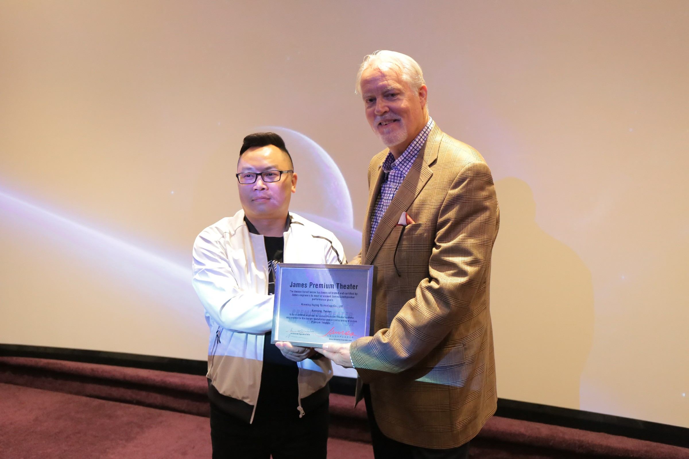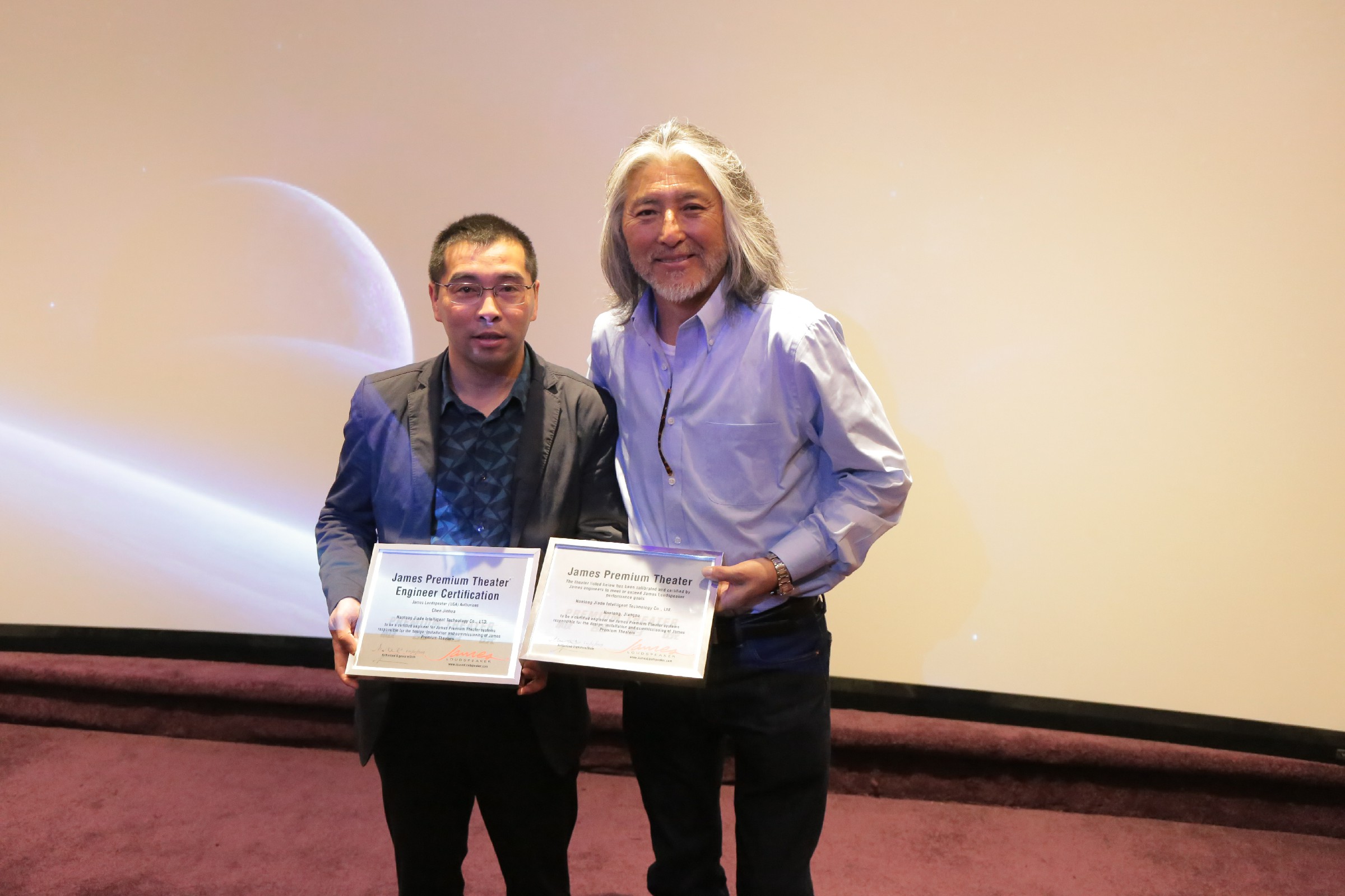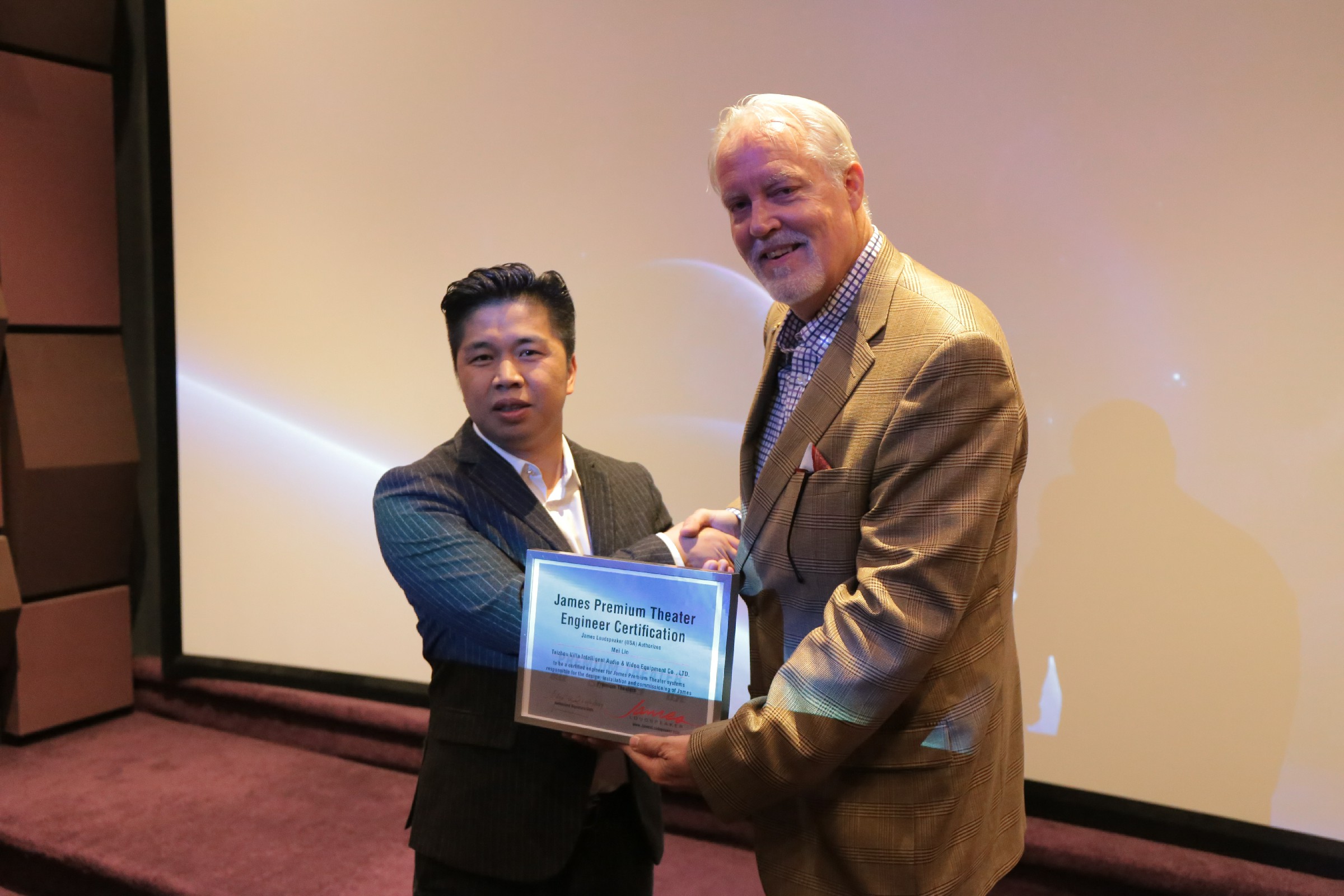 活動中,James極品之父Michael J Park先生和James品牌極品影院項目執行副總裁John Bishop,為中國James極品影院體驗中心及James極品影院工程師頒發證書。