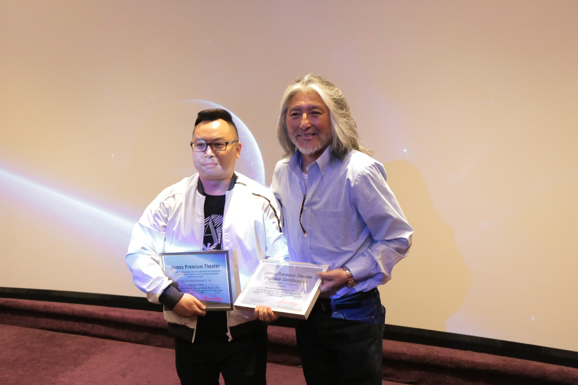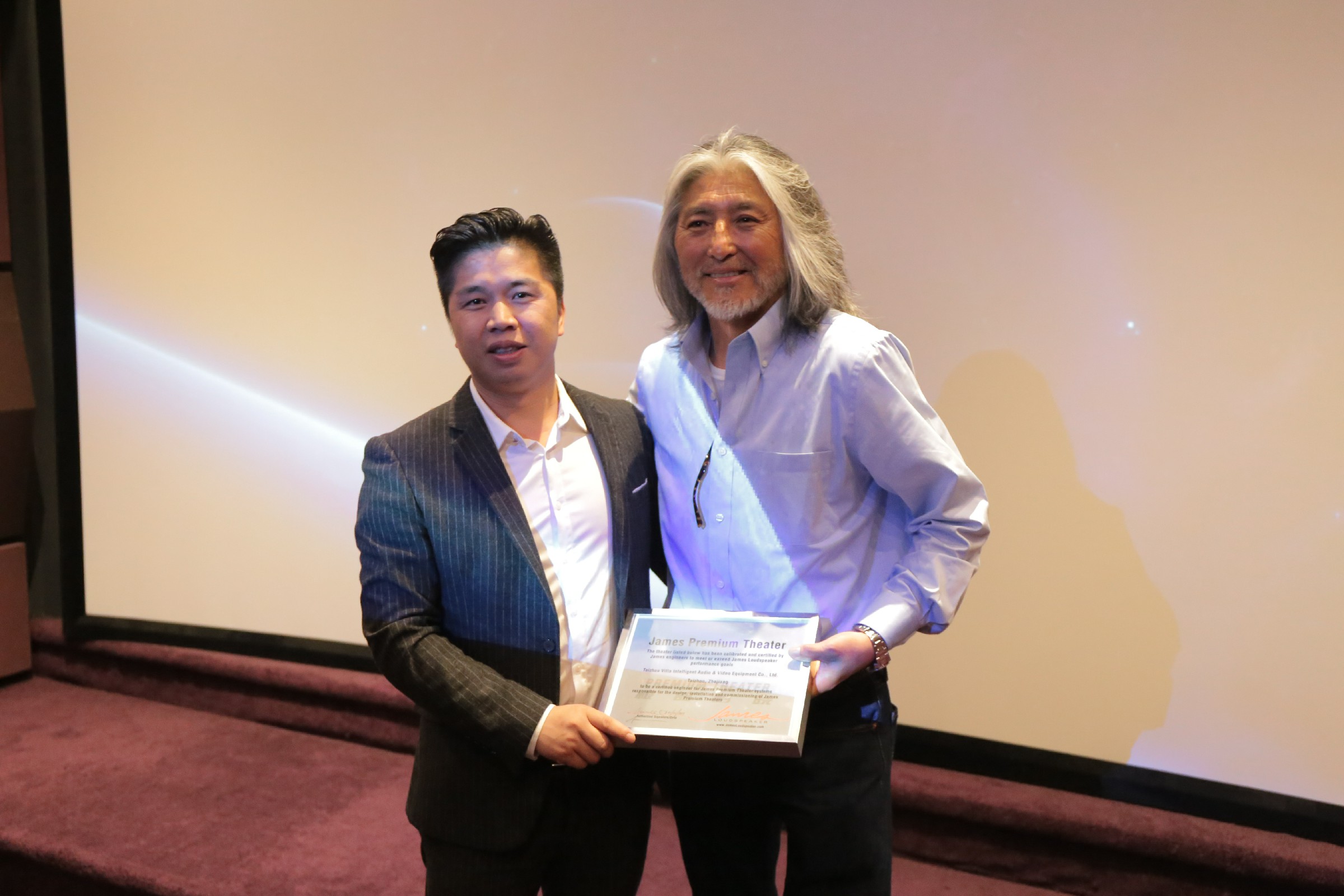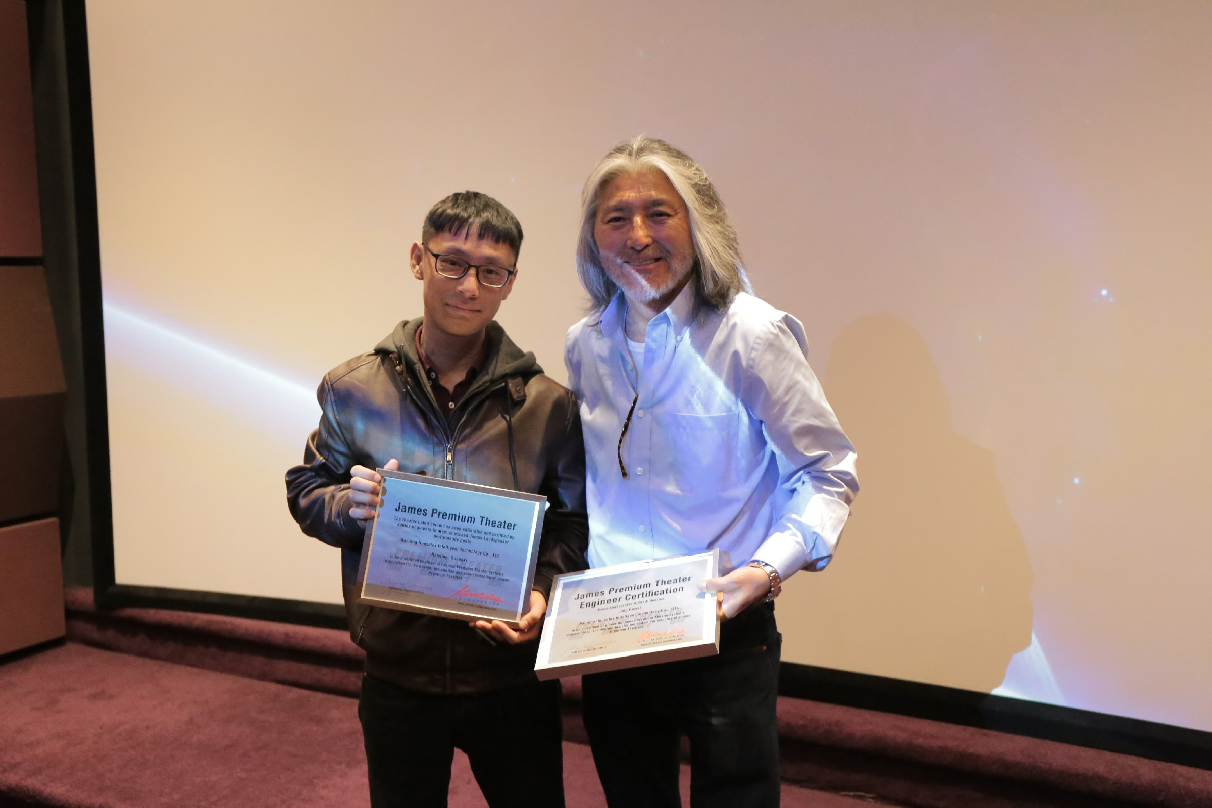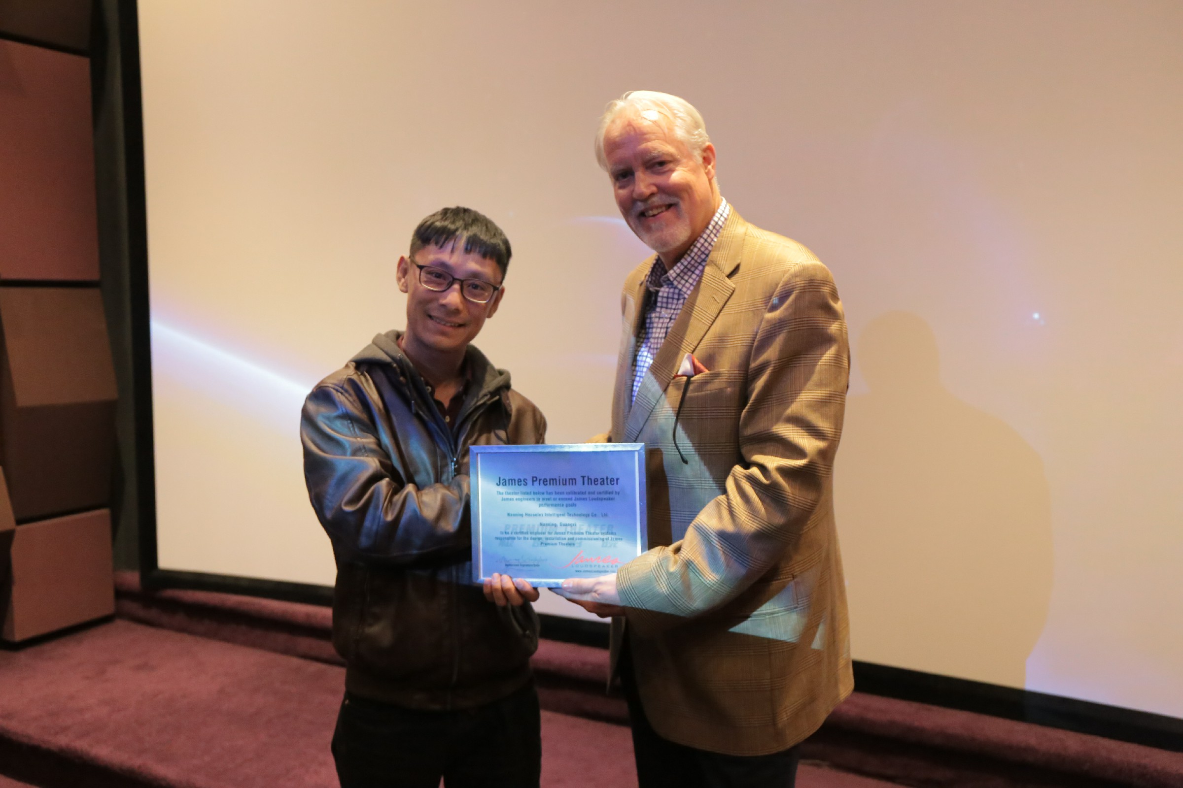 活動中,James極品之父Michael J Park先生和James品牌極品影院項目執行副總裁John Bishop,為中國James極品影院體驗中心及James極品影院工程師頒發證書。