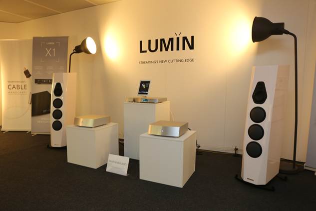 除了有靜態展示,LUMIN還有專門的演示空間。采用旗艦X1播放機,兩臺LUMIN自家的LUMIN AMP功放,搭配一對新進德國品牌喇叭Vimberg來開聲演示。