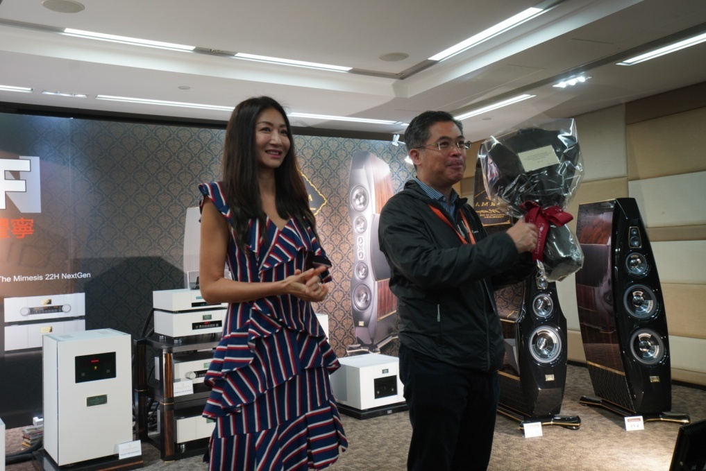 《影音極品》總編 Eric Fung(右)為Susan Wong獻(xiàn)花以示感謝和歡迎參與AVF 2019!
