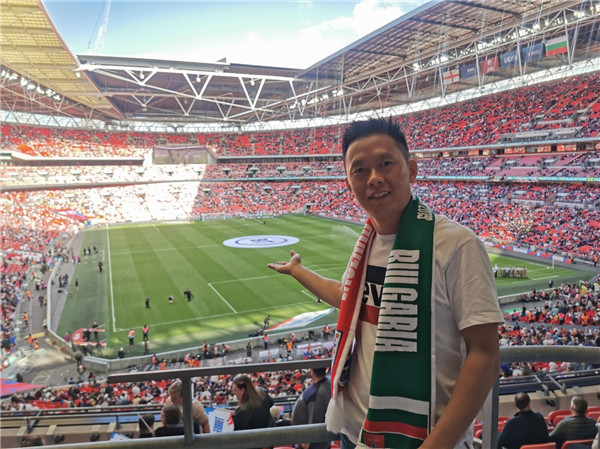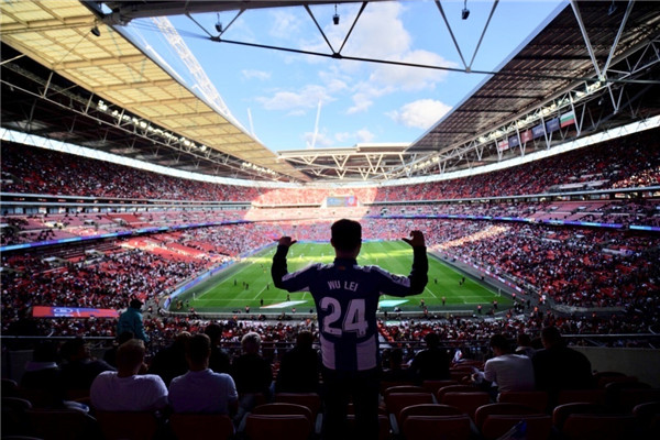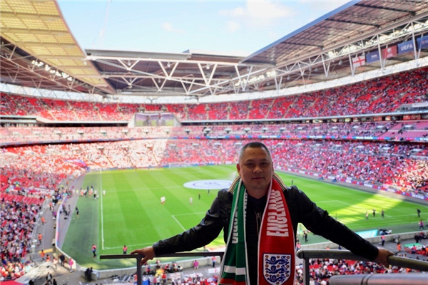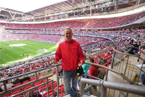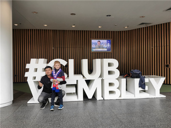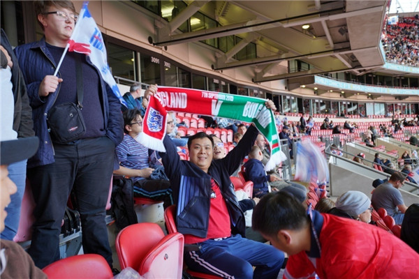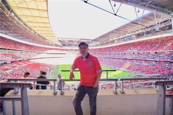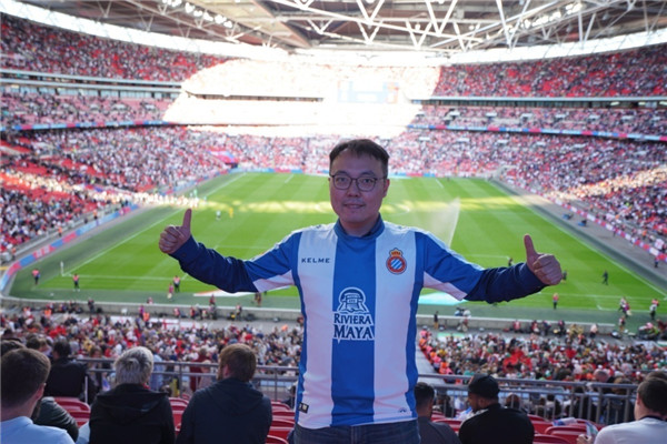 作為中國足球的擁躉,第一個身穿上港球衣在西班牙人主衛武磊加油的球迷的愛威曾總,依然身穿著武磊的球衣來到現場,預示著將來中國人會在溫布利進球。