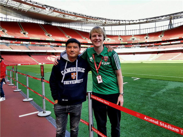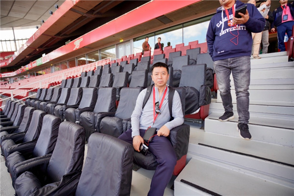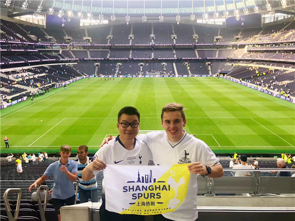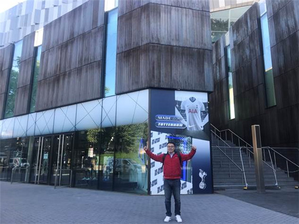 圖中左邊這位先生英文名字Roger,他大學時期留學英國,當時因為被白鹿巷球場特殊的氛圍設計所吸引,從沒有體驗過那么好的球場氣氛,從而成為了熱刺球迷。后來回國后專門從事歐洲足球方面的工作,而此次2019愛威游學會前期很多安排規劃,都是由Roger先生策劃。甚至包括機票幫我們選擇了維珍而不是英國航空(我們返程那天正好碰到英國航空罷工,萬幸),恰巧在愛威參觀球場后的一周,Roger也來到倫敦全新熱刺球場為熱刺的比賽助威加油。目前他也是上海熱刺球迷會的主要領導人。