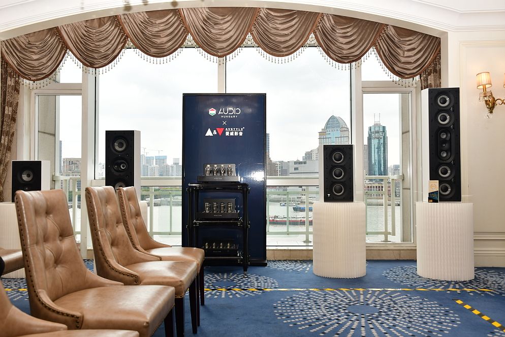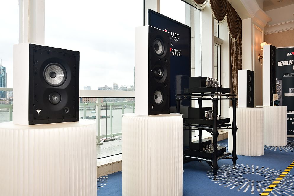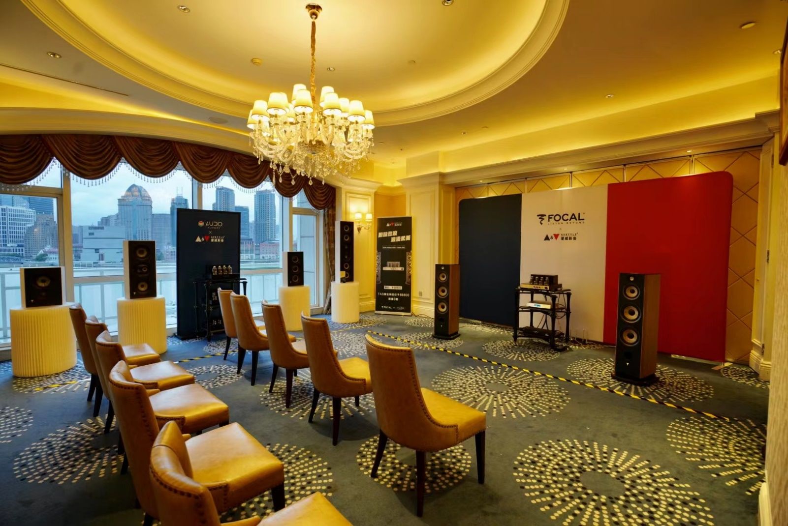 走進展廳首先映入眼簾的是外灘無敵江景,落地窗下靜態展示了Focal 1000系列定制安裝音箱和Audio-Hungary C200+P200前后級。