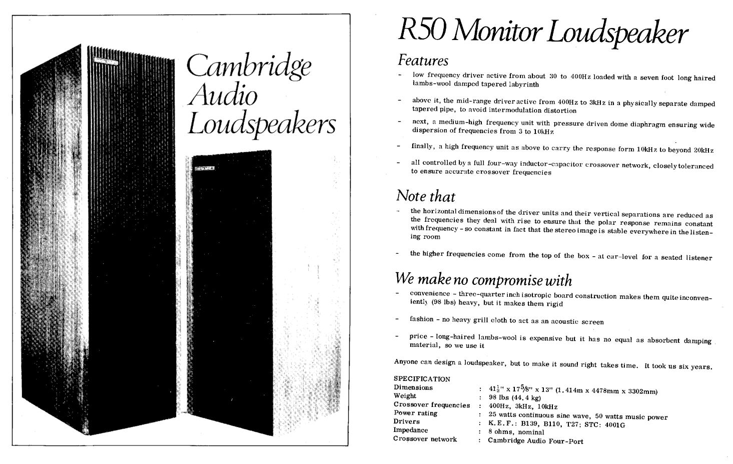 1971年劍橋音響開發(fā)了R50傳輸線式音響,R50音響采用七英尺錐形迷宮構造,長羊毛減震設計。所有這些全都有助于減少失真,而且效果明顯,至今仍舊是揚聲器開發(fā)的標桿型作品!
