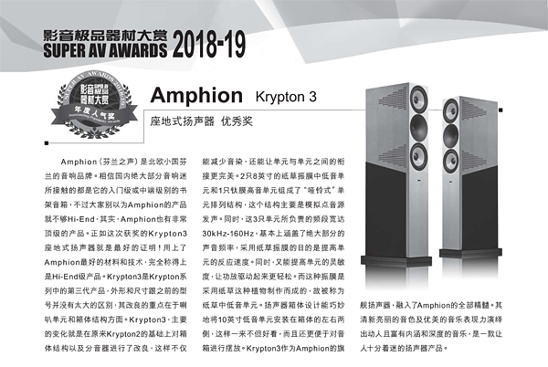 Krypton 3是Amphion現(xiàn)役的旗艦喇叭,以往接觸Amphion,總覺得Amphion擅長精致且準確的小品,每一款A(yù)mphion書架喇叭都很不錯,可是Krypton 3卻改變了這個品牌的上限屬性,所有的Amphion喇叭都有精致準確的音場定位,Krypton 3也不例外,但是Krypton 3在中低頻段的豐沛能量,還有清晰的音樂層次,確實值得旗艦喇叭的稱號,整體音樂表現(xiàn)溫暖、開闊又寬松,堪稱最具代表性的「芬蘭之聲」。假如您擁有夠大的聆聽空間,想找音樂能量充沛的大型喇叭,Krypton 3是必選之作。