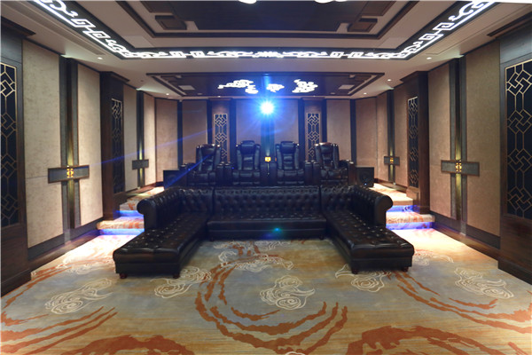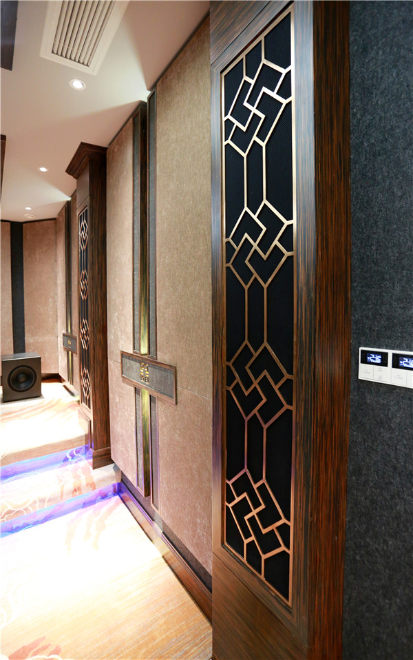 空間內的所有揚聲器都完美隱藏于中式的模塊化聲學架構中,不但美觀大氣、更便于以后對于音響系統(tǒng)的升級改造。在聲學處理方面,除了靠鋪設地毯來進行聲音的吸收,同時在四周的墻壁內與天花上也加入吸音材料,在側墻和后墻做了擴散處理,可謂是考慮的相當周到。