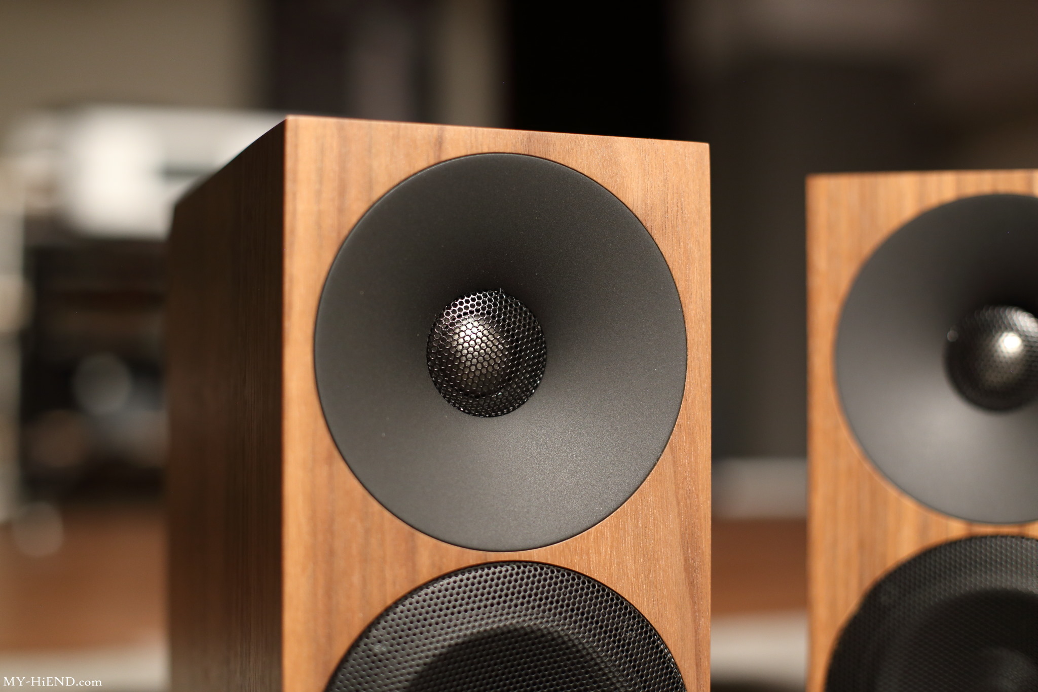 看看這質(zhì)感真不是蓋的,上方高音單體在中央有金屬反光保護(hù)網(wǎng)的部分,使用的是1英吋的鈦金屬振膜,更特別的是周圍有類似號(hào)角設(shè)計(jì)的黑色凹盆,這是Amphion獨(dú)家的均勻定向擴(kuò)散(Uniformly Directive Diffusion, U|D|D)技術(shù),就是要讓高音單體的聲音能平均穩(wěn)定地?cái)U(kuò)散到空間當(dāng)中,降低高音指向性明顯的特點(diǎn)。中低音單體則使用4.5英吋的紙盆振膜,紙振膜能重生更接近自然的音色。