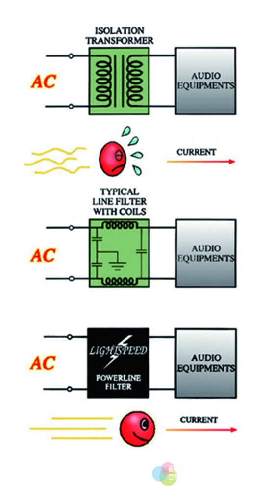 目前市面上電源處理器有穩壓器(Power Generator)、隔離變壓器、濾波器三種,穩壓器其實就是電源再生器,先將市電交流電轉成低電壓直流電,再轉成干凈的交流電,此類型最知名者當屬PS Audio Power Plant,理論上電源再生器是最理想的電源處理器,不過造價往往也是最高的;隔離變壓器(Power Isolator)廣泛用于工業機械設備,內部結構含初級、次級線圈,前者連接市電,后者連接輸出插座,兩組線圈之間會施加多重靜電屏蔽層與接地,并使用高頻響應較差的鐵心材料來降低高頻噪聲,其構造相對簡單,但為了要適用訊源、前后級,隔離變壓器的輸出電壓至少要高于器材內部電壓兩倍,才不至于壓抑動態,因此隔離變壓器必須做得又大又笨重,造價也不便宜。第三種電源濾波器(Power Filter)最常見,做法是使用電感、電容與少量電阻濾除極高頻噪聲,并搭載金屬氧化變阻體(MOVs)吸收瞬時突波,一般電源濾波器能濾掉100kHz以上極高頻噪聲,高檔濾波器可以低至10kHz。