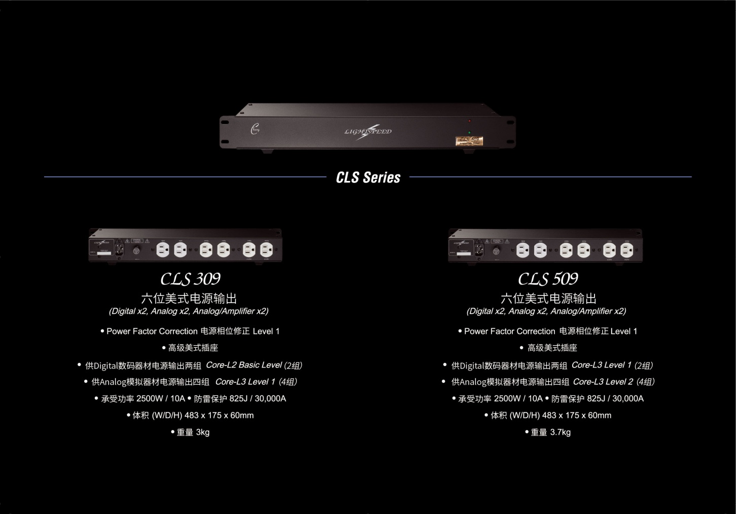 按照Lightspeed官網說明,不論濾波器或隔離變壓器,只要搭載線圈,終將不可避免造成訊號延遲(time-lag),影響聲音表現。那么光速 Lightspeed如何改良電源濾波器呢?原廠對此有意保密,只提到是一種由復合磁性材料所組成的傳導組件,乍看之下如白色燈管,姑且稱作濾芯吧!在入門型號CLS309中就用上三根,一根供數字訊源,其余兩根供擴大機,此種濾芯也有分等級,由低至高是K4、L2、L3、L4、R2;又有分濾波階數(Level),階數越多濾越多次,效果越好,以CLS309來說,負責數字訊號的采用K4(Basic Level),模擬放大則是高階L4(Level 1)。CLS309即使是最入門的款式,仍擁有功率因子修正(Power Factor Correction)功能,改善交流電電壓與電流轉換的相位差,從內部來看,應是左側的黃色電容負責這項工作。另外CLS309內建的電源線頗有份量,內含三股導體(線徑14gauge),直接連到機箱內電路板,電源線分離與否、長度都可以克制。如果您有兩部電源處理器,也可串接使用,后端濾波效果將會加倍,前提是前端設備的電容量必須大于(等于)后端設備,再來是保護器材最重要的突波接收器,CLS309設有三顆,最高可承受3萬安培。不過CLS309主要是濾除市電RFI、EMI干擾,接地不良所造成的哼聲不在處理范圍內。