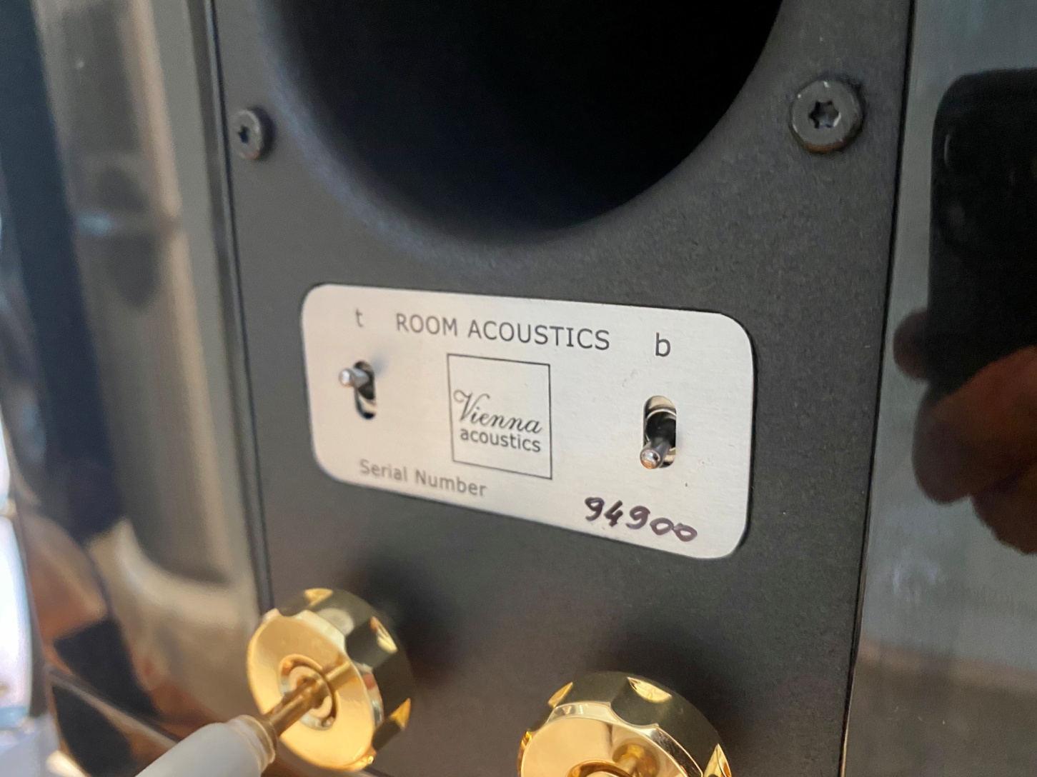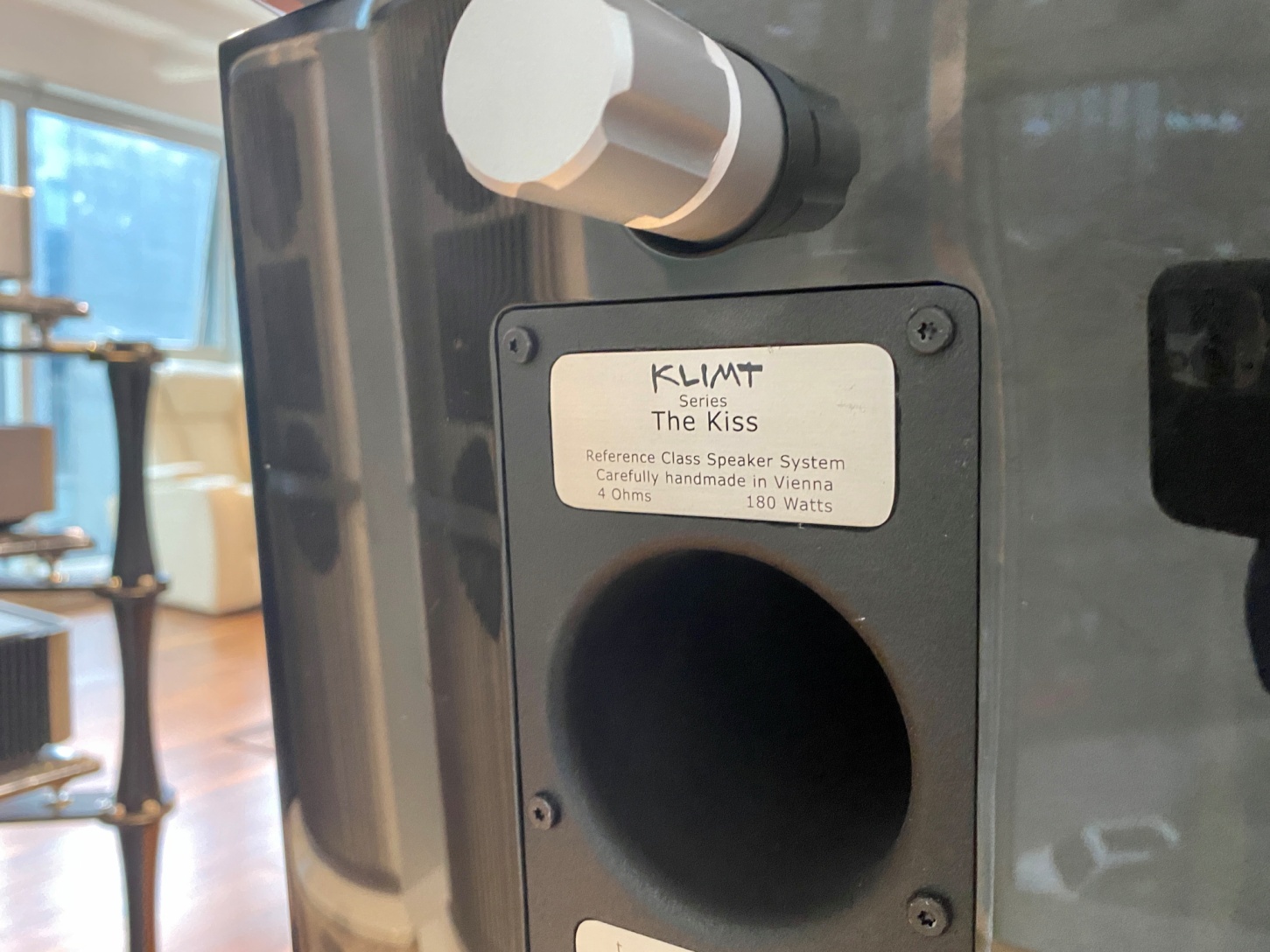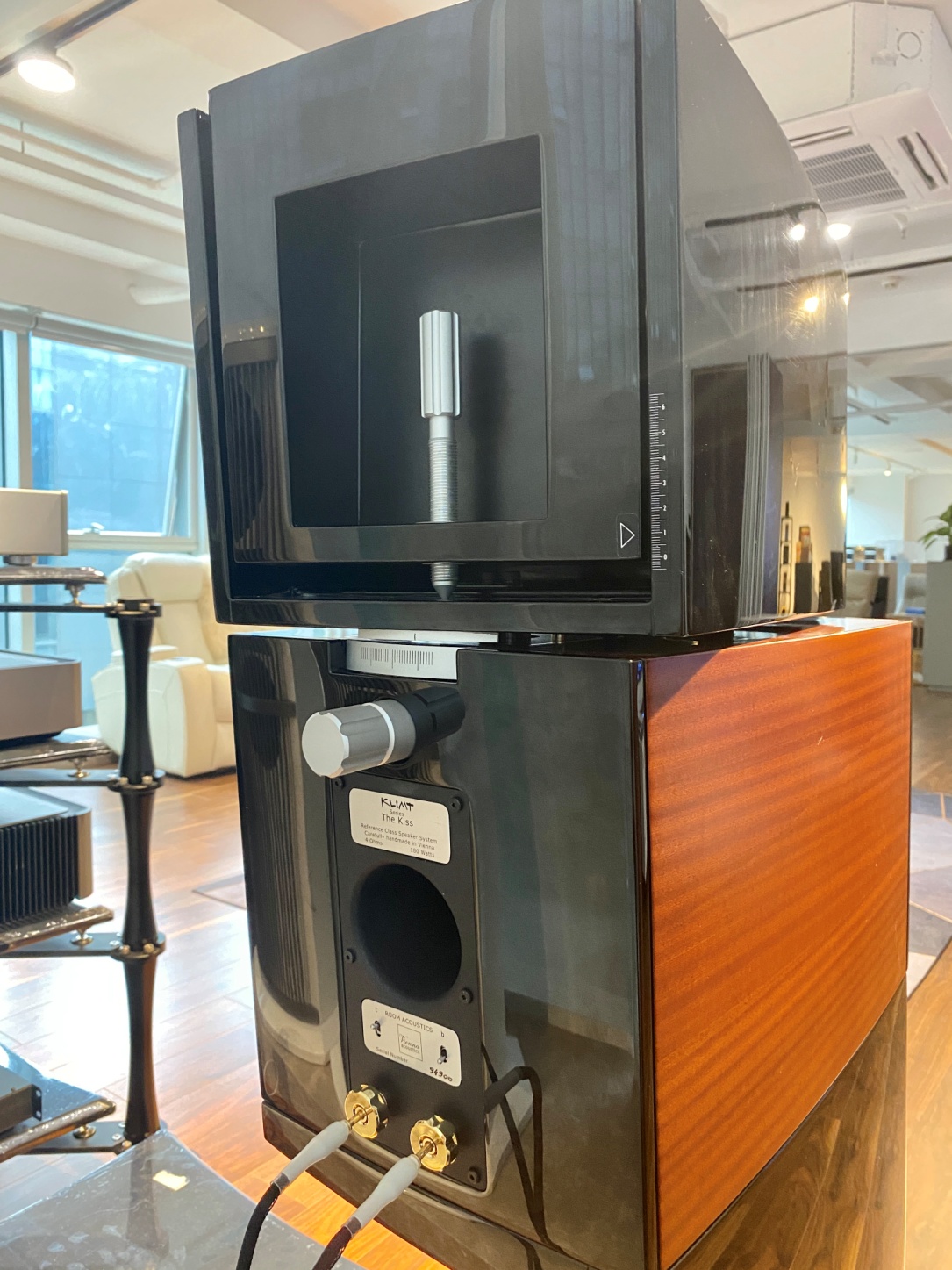 The Kiss的銘牌上寫著基本的信息和源自于維也納手工生產。和其他維也納之聲大大的音樂家銘牌相比,這對喇叭銘牌還是挺小巧的。因為實在是沒有地方去貼大銘牌,像這樣一對書架箱背面有這么豐富的調節,也只此一家了。