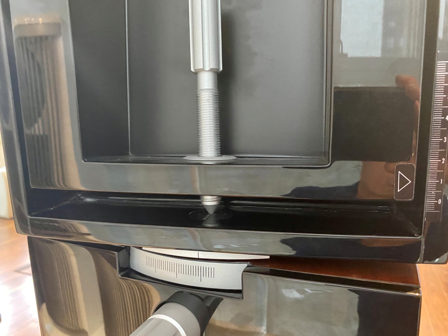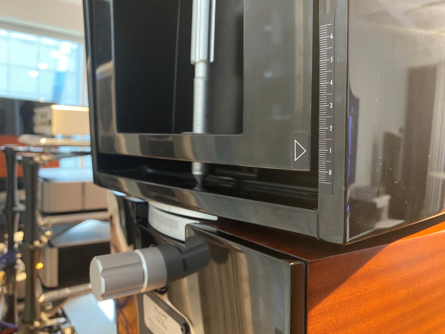 近距離可以看到刻度表,在邊沿的上邊沿有一個標記,下面是刻度,可以讓左右喇叭調整到相同的旋轉角度。不得不額外提一下這喇叭的漆做得真不錯,三樓下的車都映射出來。