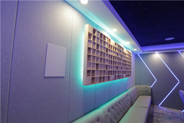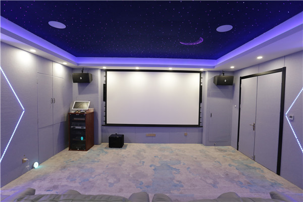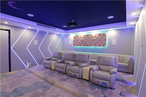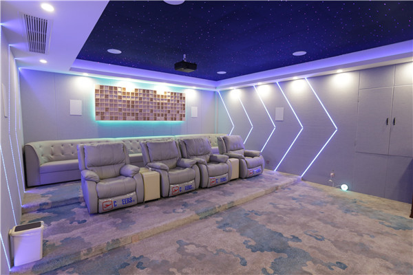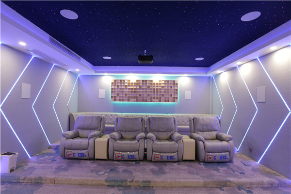 視聽室采用簡單明亮的配色、極簡主義的設計與星空吊頂相融合,搭配專業高保真的影音效果,展現了科技的靈動感。整個房間雖然不是很大,但卻融合了7.1.4的全景聲系統,所有喇叭全部隱藏,既不影響室內的整體設計感,又可以享受到家庭影院帶來的樂趣。